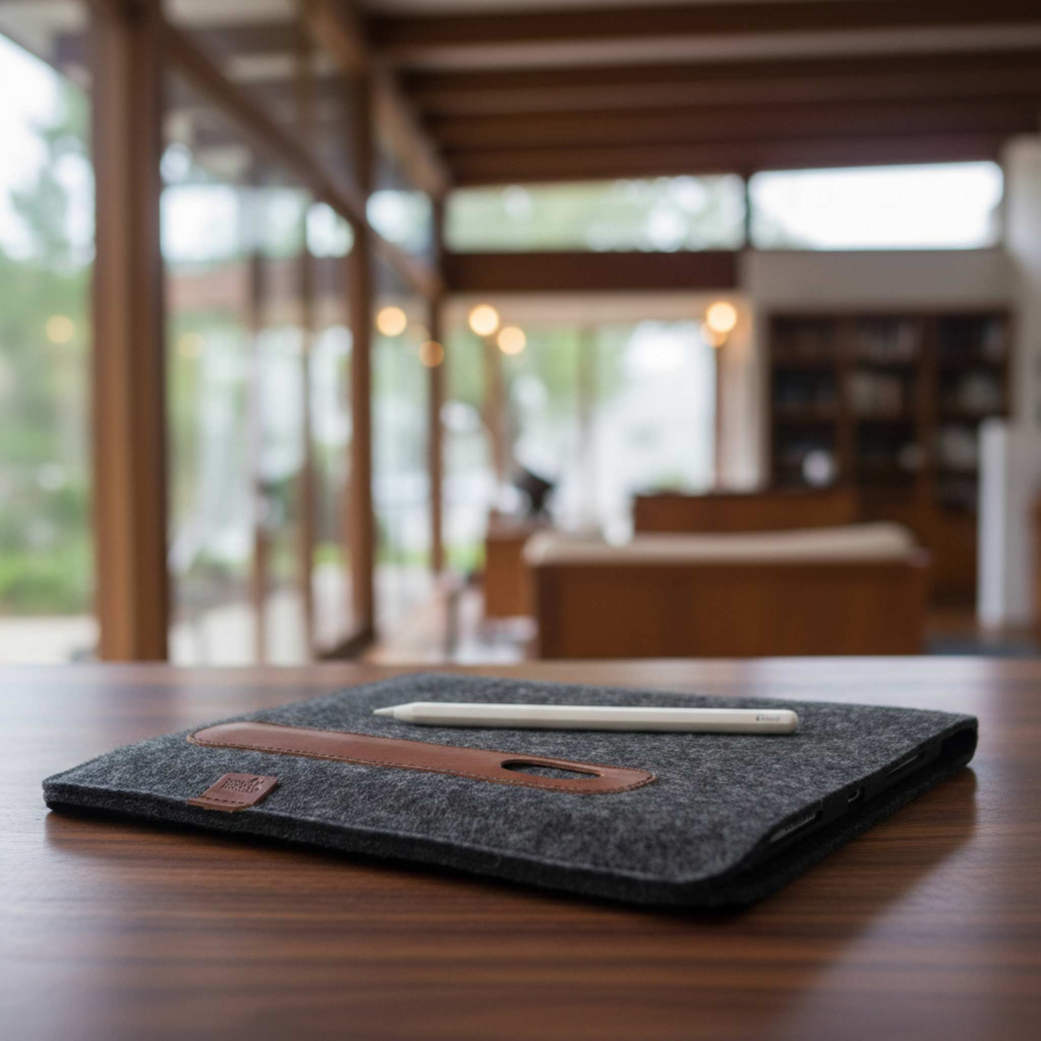 “SUFFOLK” made from 100% merino wool felt with leather holder for the Apple Pencil – perfectly tailored for the Magic Keyboard. Available in dark or light gray with light brown leather.
